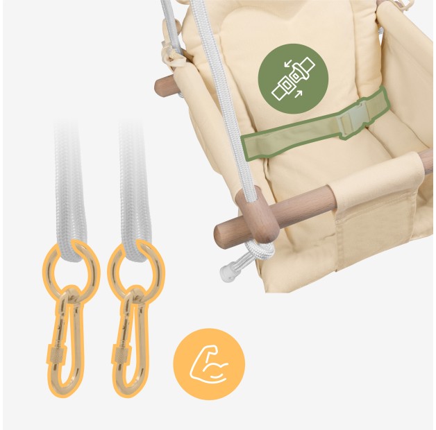 Zawsze zdejmować po zakończeniu zabawy: Po każdym użyciu huśtawkę należy zdjąć i schować do pomieszczenia. Nie pozostawiać huśtawki na zewnątrz na noc lub podczas niepogody – wilgoć i promienie UV mogą uszkodzić drewno oraz tkaninę. Używać tylko w suchych warunkach pogodowych.